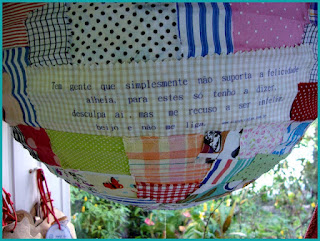 Não é linda? Foi feita com retalhos, cola, luminária japonesa e muita criatividade.